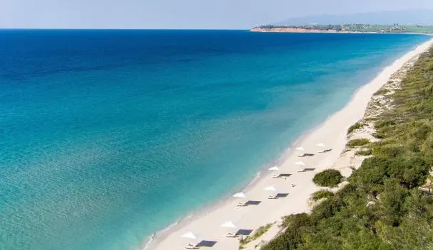 The 5-star Aegean Melathron is surrounded by a forest reaching down to a beach by Toroni Gulf. Guests have free access to the gym and 9 swimming pools.